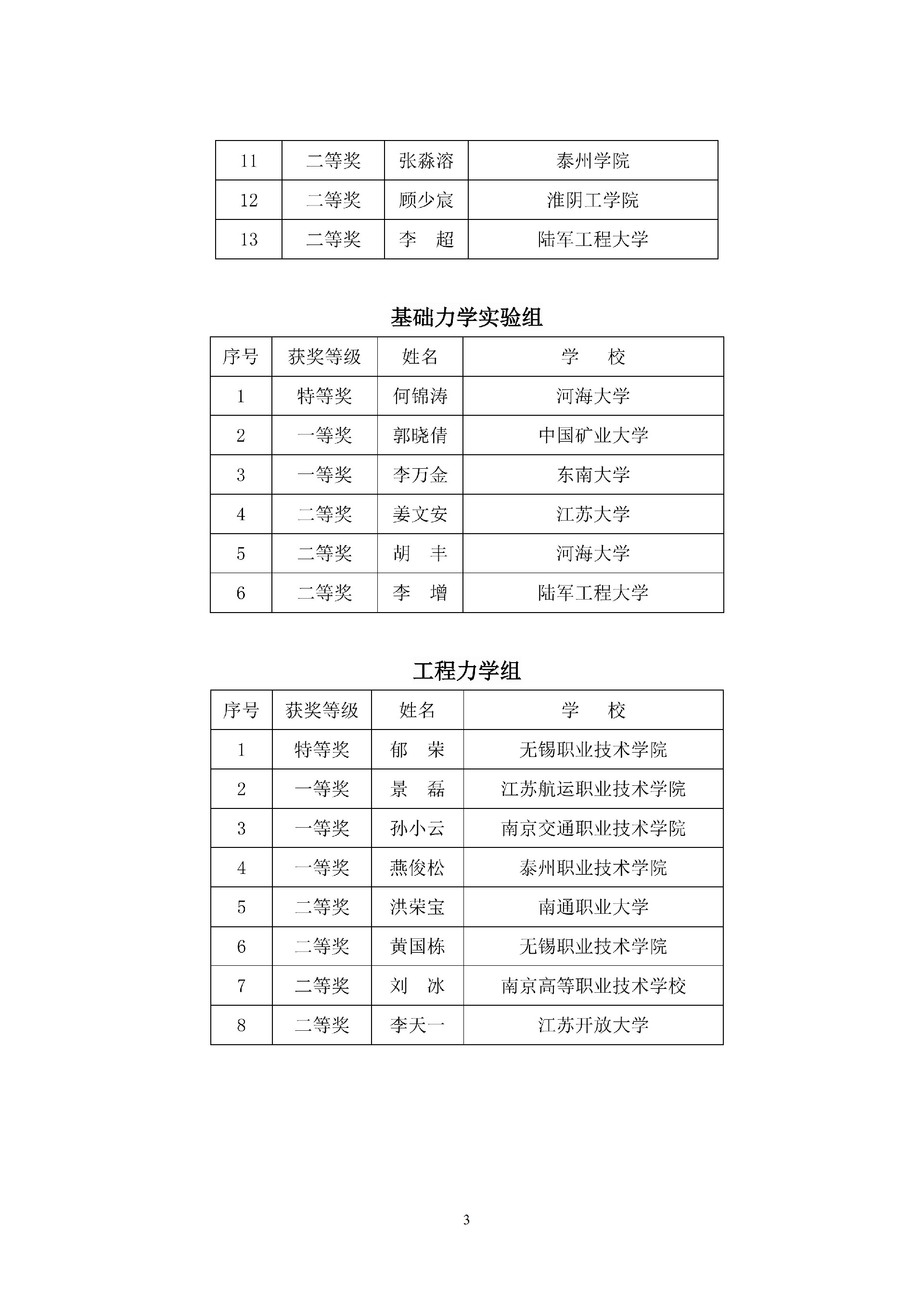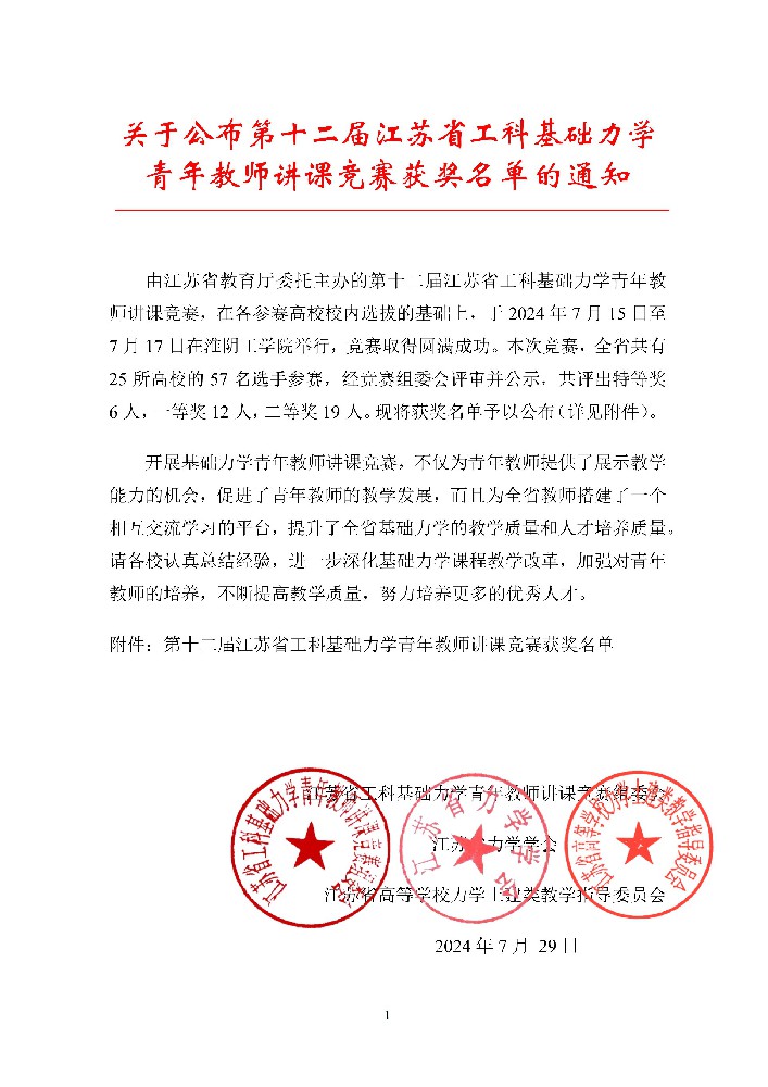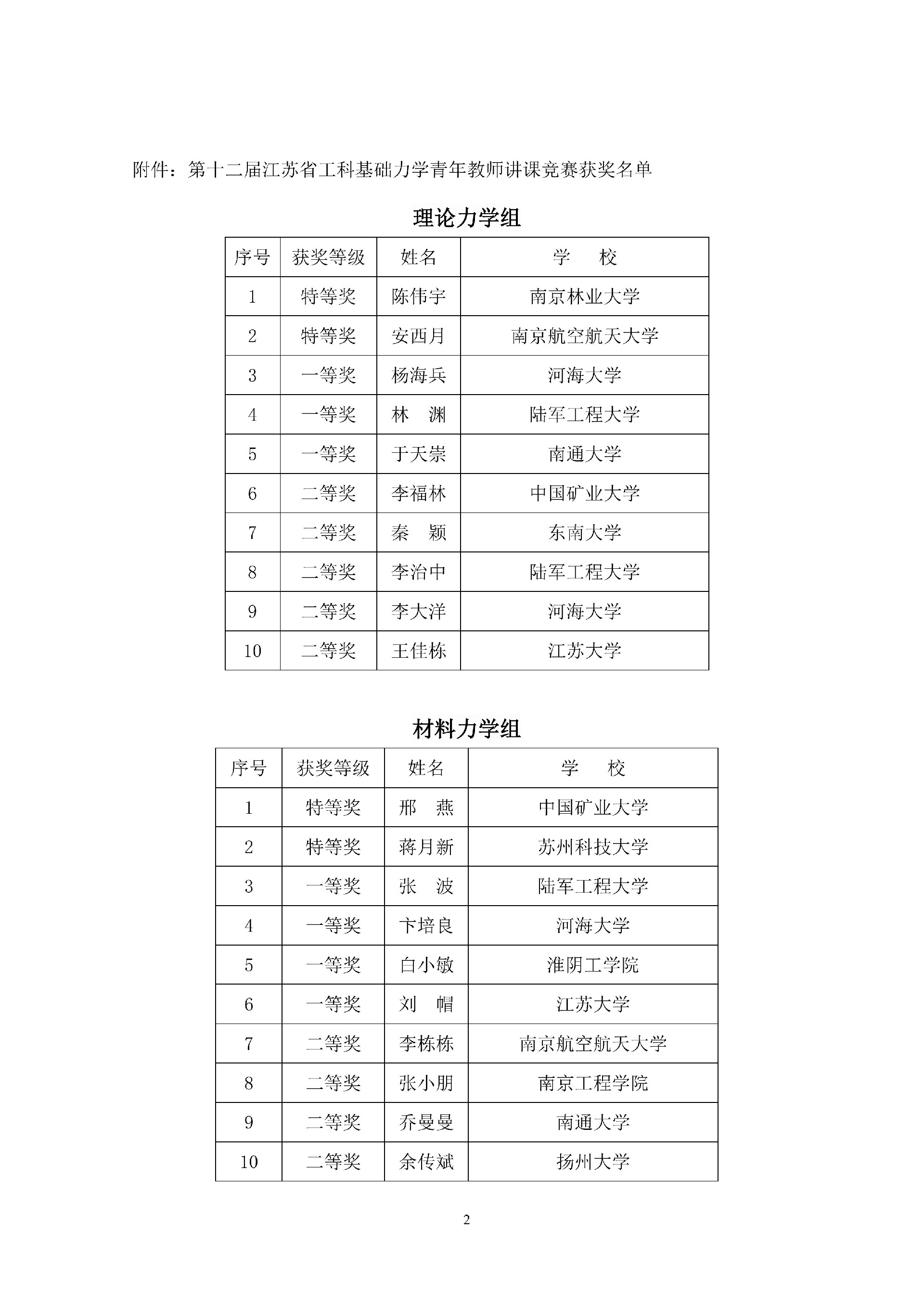 关于公布第十二届江苏省工科基础力学 青年教师讲课竞赛获奖名单的通知